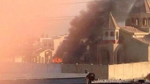 Os islamitas também puseram fogo na casa do arcebispo católico da cidade e numa igreja de 1800 anos (que não sei se é católica, assíria, ou síria ortodoxa), como vocês podem ver aqui:
