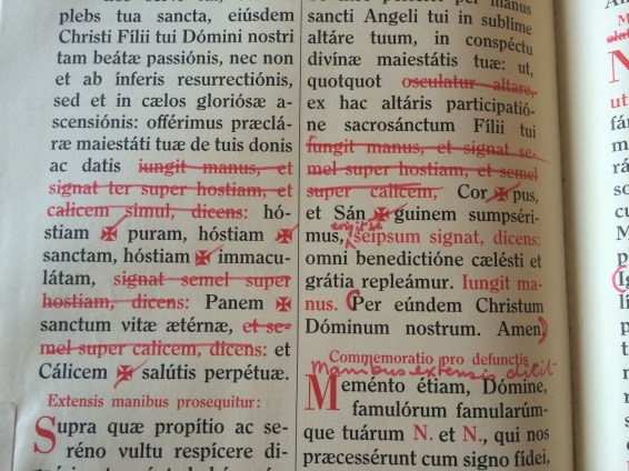 A Secreta é para ser cantada nas missas cantadas ou recitada em voz alta nas outras Missas. A doxologia no final do Cânon, iniciada com as palavras Per ipsum, é para ser cantada ou rezada audivelmente, e os cinco sinais da cruz omitidos. O Pai Nosso pode ser cantado ou recitado junto com o celebrante em latim ou na língua vernácula, mais uma vez diminuindo o papel distinto do sacerdote [3]. O embolismo [4] Libera nos, quaesumus Domine, depois do Pai Nosso, pode ser cantado ou rezado audivelmente . Nas Missas com uma congregação as Lições, a Epístola e o Evangelho serão lidas de frente para o povo e o vernáculo é permitido em todas. Um leitor ou acólito pode ler as Lições e a Epístola enquanto o celebrante senta e ouve. Até nas Missas cantadas as Lições, as Epístolas e o Evangelho podem ser lidos no vernáculo e não mais cantados.