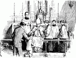 OBS: Na Igreja primitiva, os três sacramentos de iniciação – Batismo, Confirmação e Eucaristia – eram celebrados na Vigília Pascal com catecúmenos adultos. Esses eram imersos numa piscina para o Batismo. Então, vestidos com uma túnica branca, o bispo impunha as mãos sobre eles e os ungia com óleo (Crisma). Passavam para um lugar de honra na comunidade, de onde comungariam pela primeira vez. A iniciação, portanto, consistia em um evento com vários momentos. O clímax era a celebração da Missa.