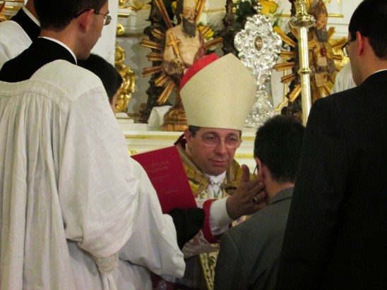 1ª O Bispo, após fazer uma alocução sobre o sacramento a ser recebido, impõe as mãos sobre todos os candidatos, indicando, assim, que os Espírito Santo quer tomar posse deles, e arrebatá-los ao poderio do demônio. Ao mesmo tempo, faz uma oração em que pede, para eles, os sete dons.
