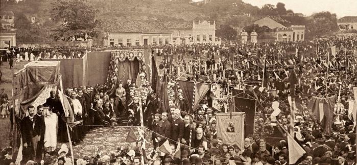 Missa campal celebrada em 1888, no Campo de São Cristóvão, Rio de Janeiro, em ação de graças pelo fim da escravidão no Brasil. Na imagem pode ver-se a Princesa Isabel. Clique na imagem para ampliá-la.