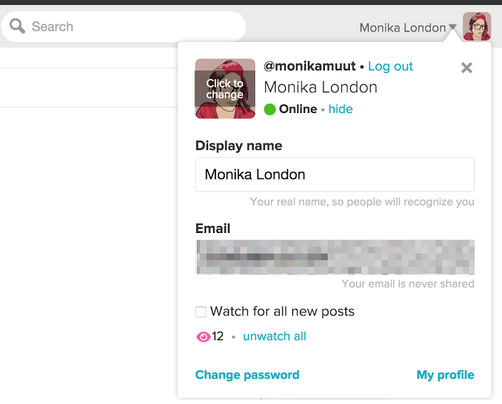 Nela se pode colocar a foto do perfil, o seu nome e o email. Também é possível administrar se você aparecerá como on line ou não, e se quer seguir todos os novos posts dos tópicos em que participou (watch for all new posts).